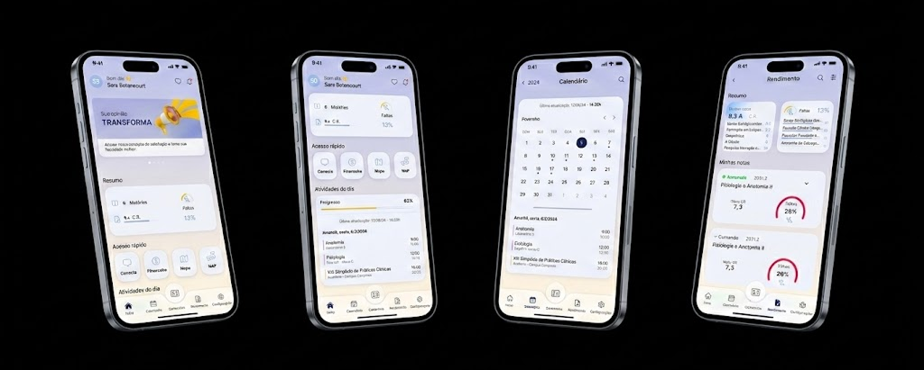- Alinhamento visual entre app, portal e site da instituição — primeira vez com consistência sistêmica